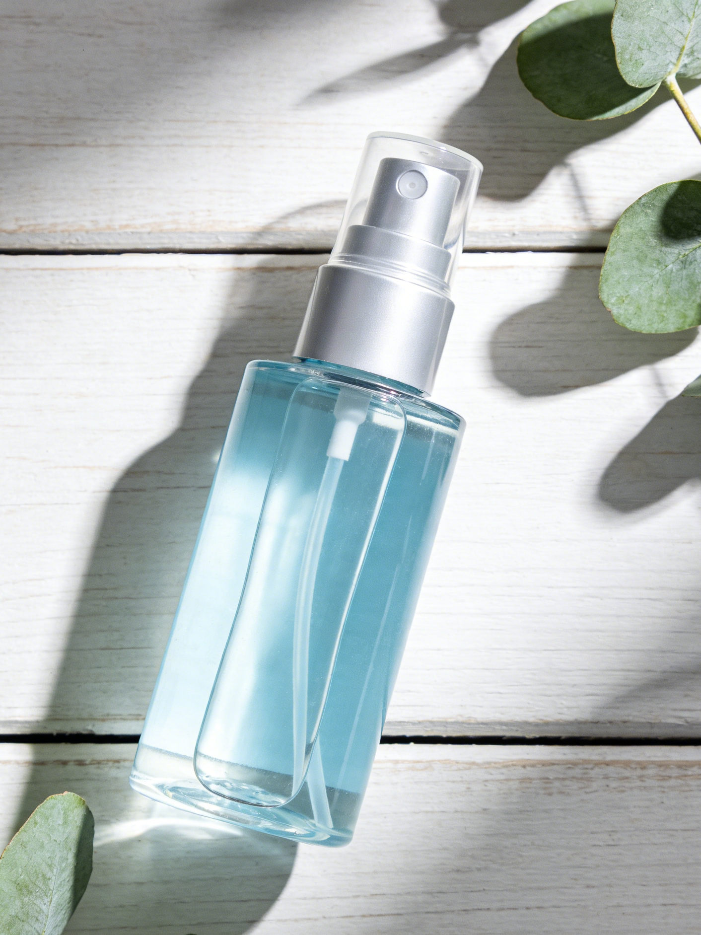 100ml 흰색과 파란색 그라데이션 병에 담긴 선크림 스프레이